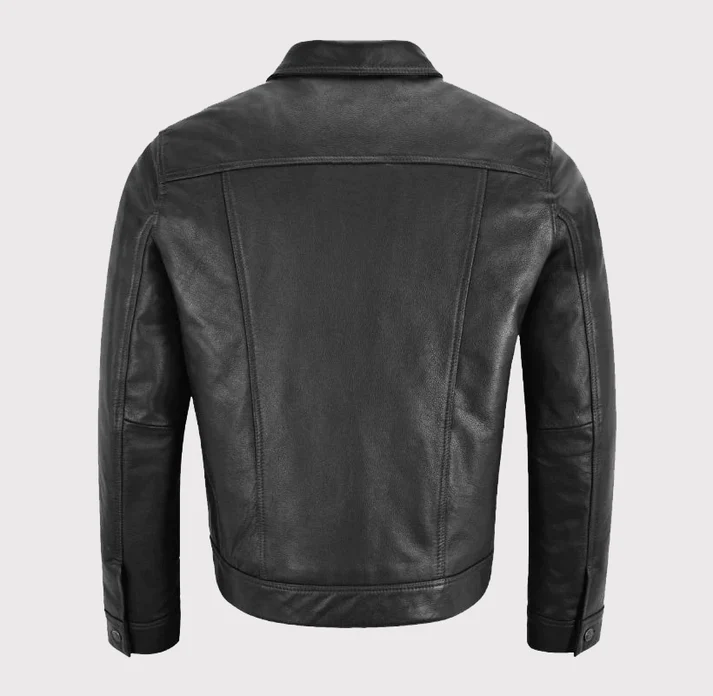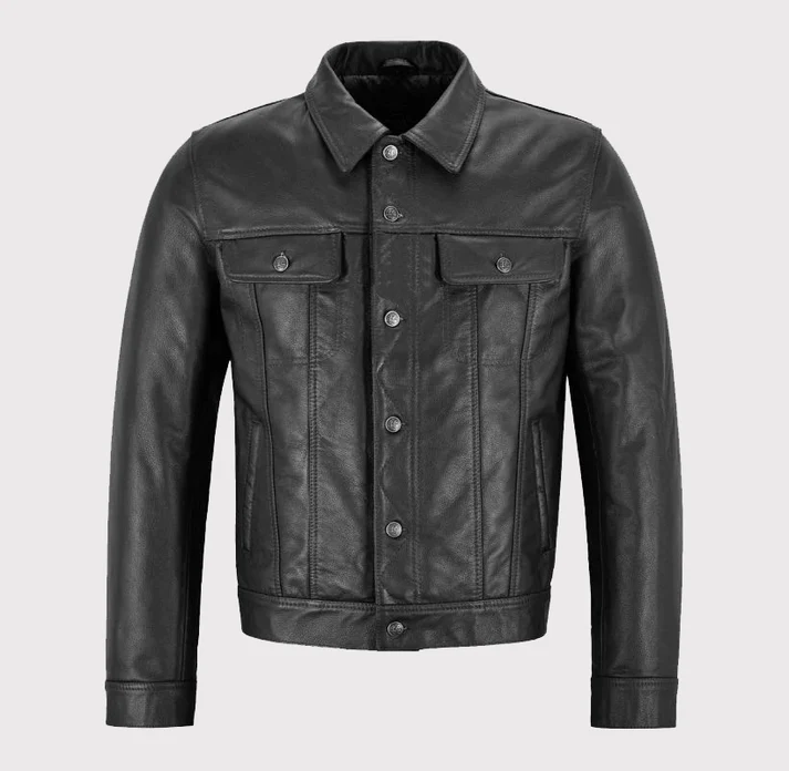 This black trucker leather jacket features meticulous craftsmanship that ensures both comfort and durability. Inside, a soft viscose lining provides a cozy layer, making it suitable for all-day wear. The button-front closure, flap chest pockets, and adjustable cuffs preserve the traditional trucker appeal while enhancing practicality.