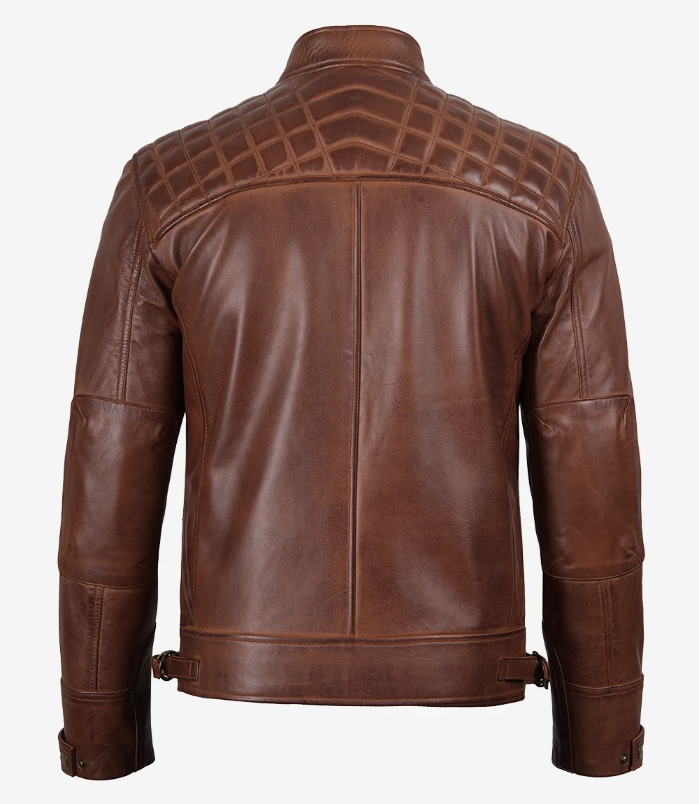 Men’s Cognac Biker Style Leather Jacket with Quilted Shoulders