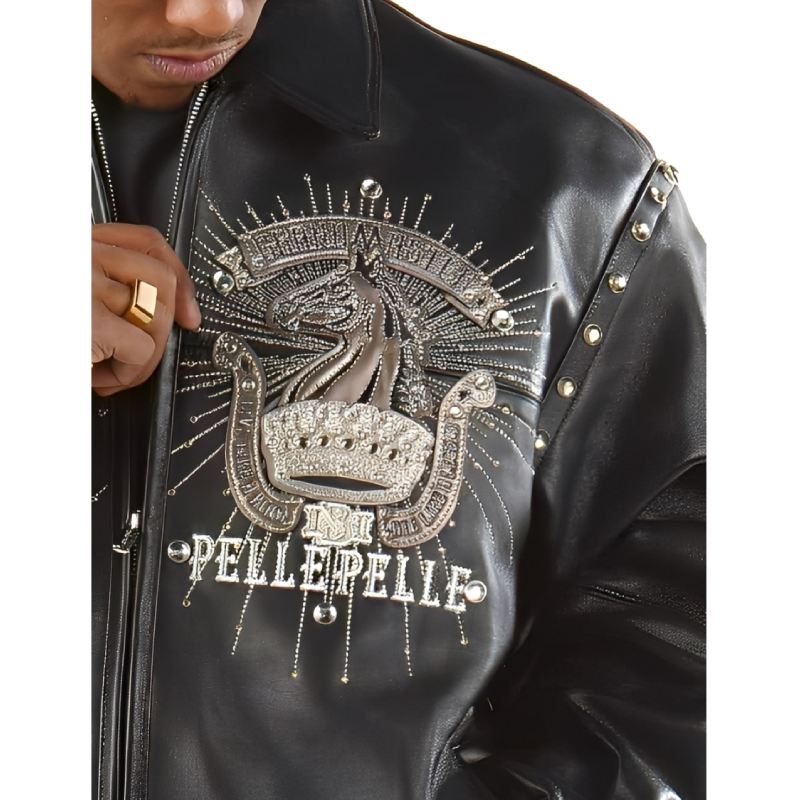Featuring signature Pelle Pelle embroidery and iconic branding, this jacket showcases meticulous craftsmanship and high-quality construction. The plush leather panels, precise stitching, and bold design elements make it a standout piece in any wardrobe, reflecting the brand’s commitment to luxury streetwear excellence.